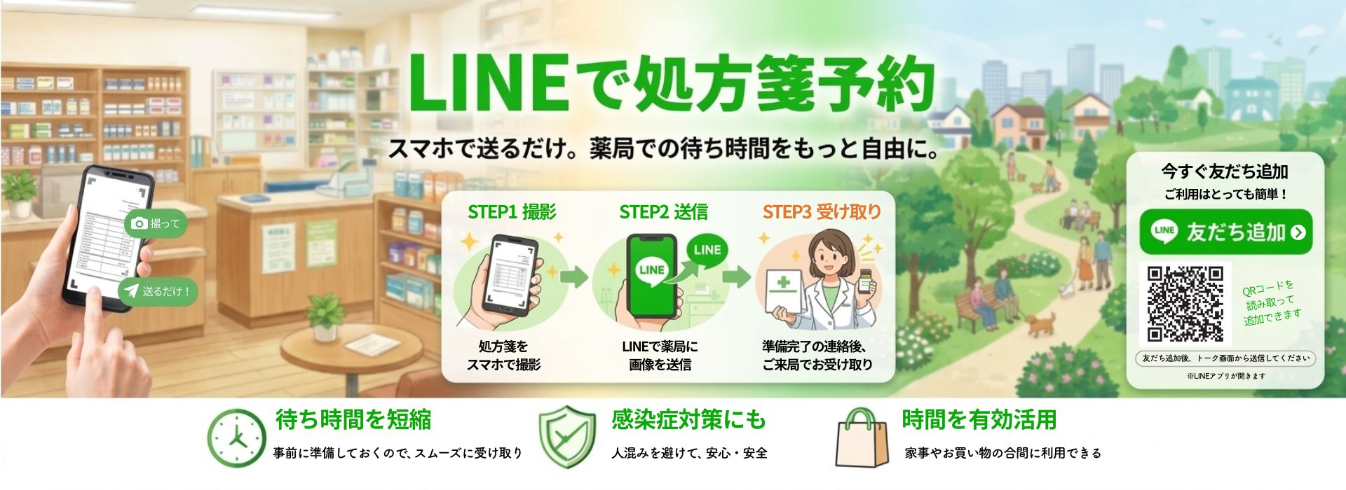 薬局前に3台、建物裏にも駐車場をご用意しております。